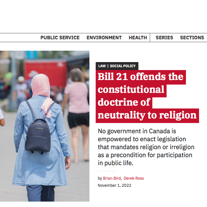 “Bill 21 offends the constitutional doctrine of neutrality to religion” by Prof. Brian Bird and Derek Ross - Policy Options