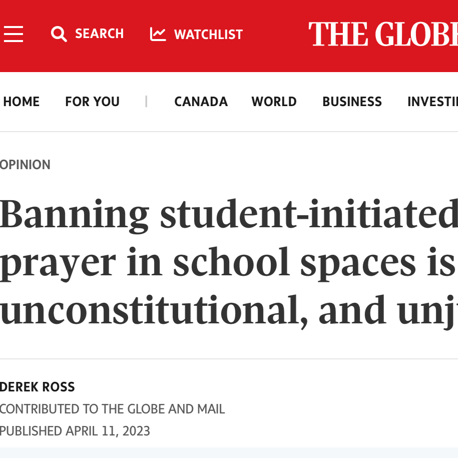 Banning student-initiated prayer in school spaces is unconstitutional, and unjust - The Globe and Mail, April 2023