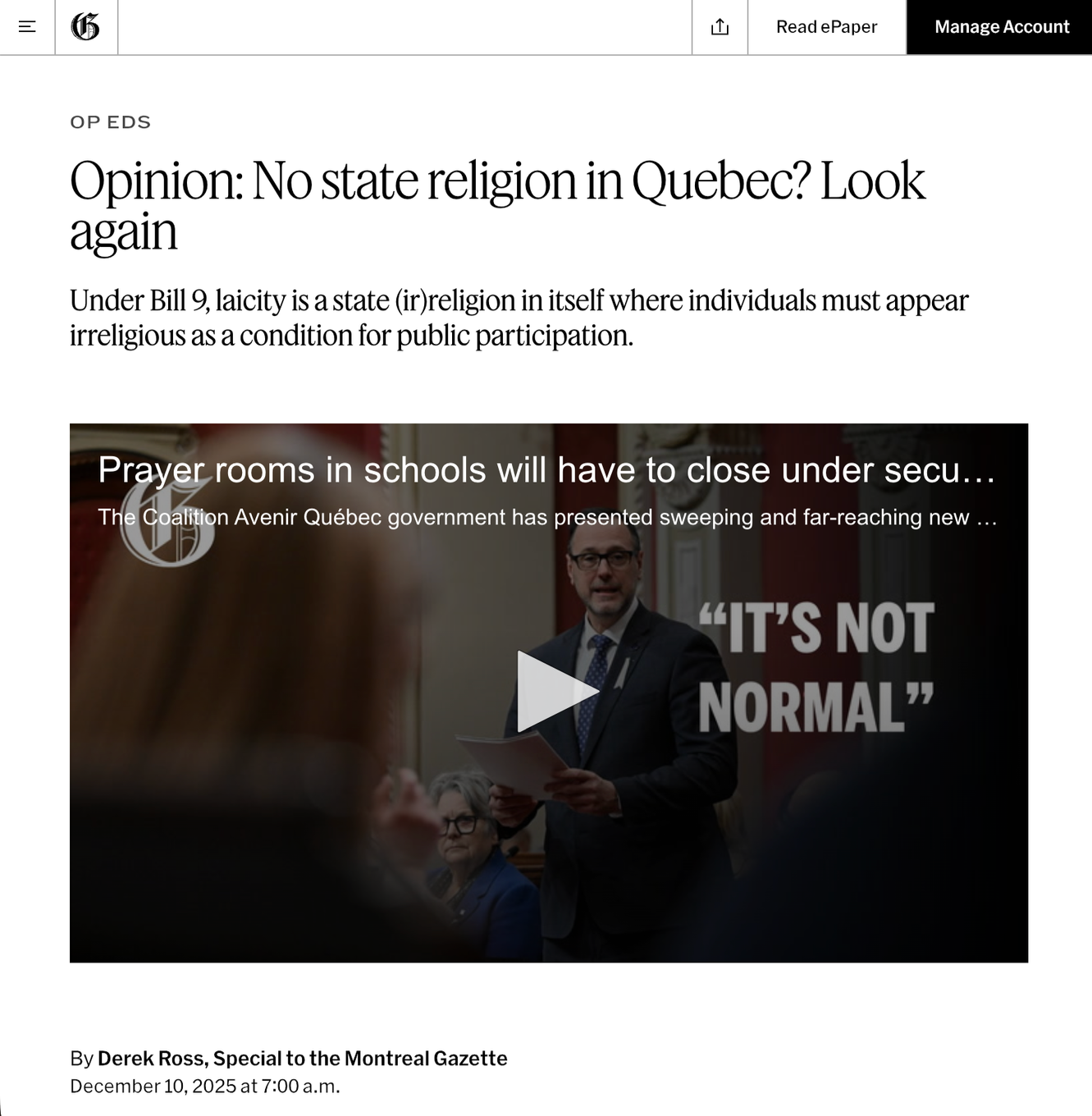 Opinion: No state religion in Québec? Look again - The Montreal Gazette, December 2025